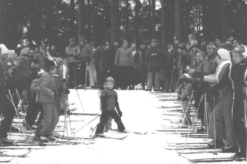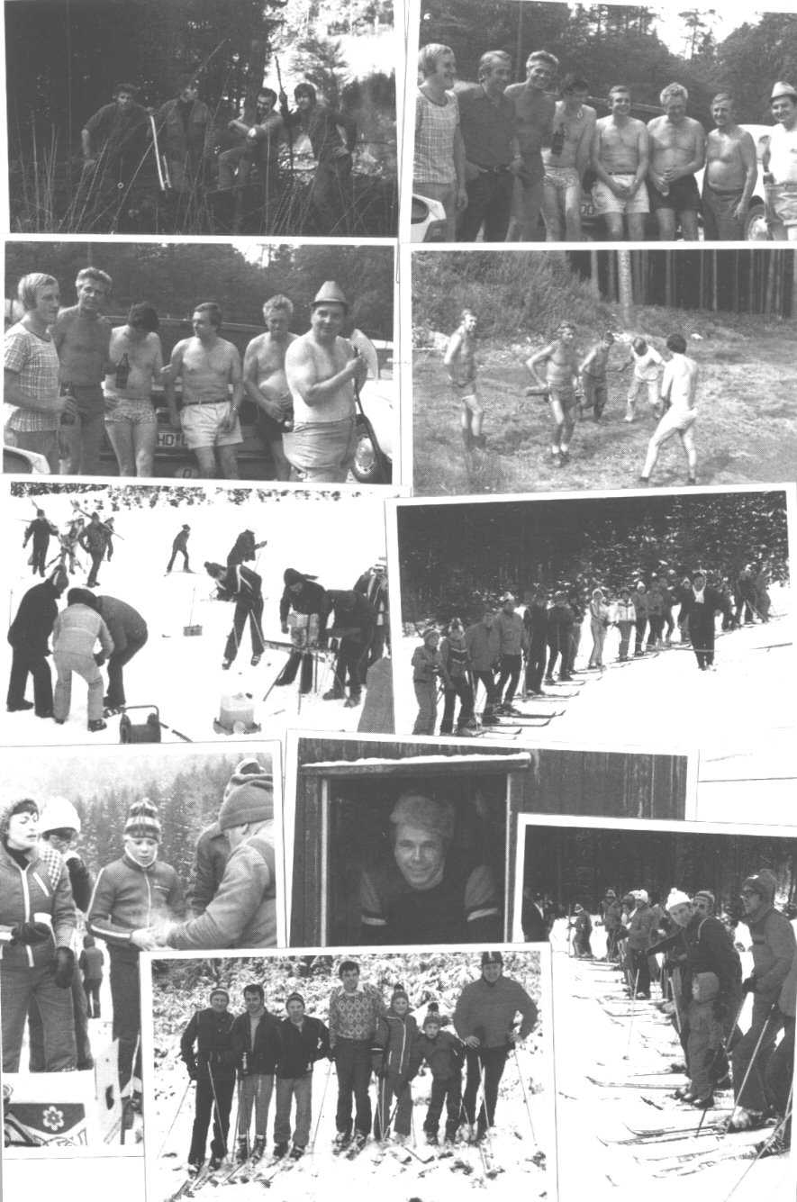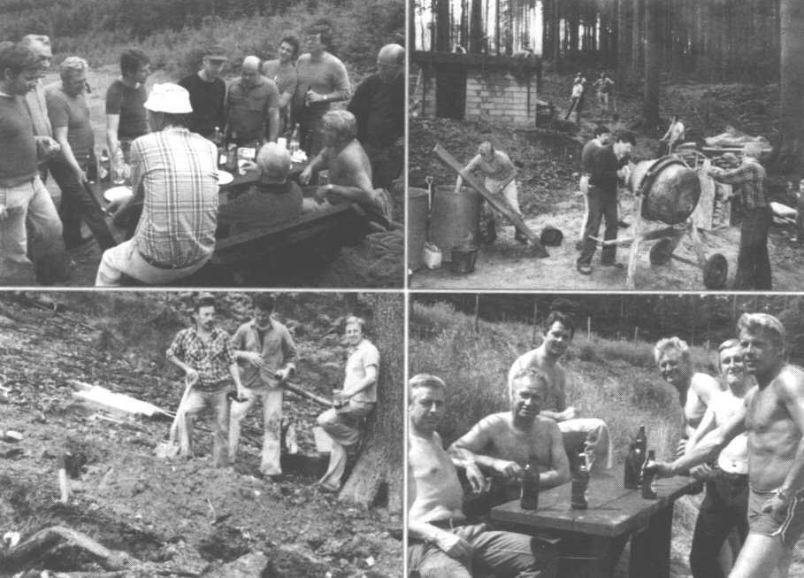 Projekt " Skihang 1972 - 1975 Bei verschiedenen Treffen und auf dem Freizeitgelände wurde immer wieder diskutiert, ob es eine Möglichkeit gibt einen Ersatz für den Eisbuckel im Dossenheimer Gemeindewald zu finden. Einige Mitglieder der Vorstandschaft beobachteten schon seit einigen Jahren die Schneeverhältnisse unterhalb des Weißen Steins. Sie kamen zu dem Ergebnis, dass sich auf der Nordseite des Waldgebietes vom Hauptweg in Richtung Norden bis zum Bärensteinweg (Bezeichnung laut Karte: Untere Kohlbach, Kniebrechweg, Kniebrech), der Schnee am längsten hält. Im Juni 1972 wurde eine außerordentliche Vollversammlung einberufen. Die Mehrheit der anwesenden Mitglieder stimmte dem Bau eines Skihangs zu. Im Herbst 1972 genehmigte der Dossenheimer Gemeinderat, das staatliche Forstamt Heidelberg und die zuständige Umweltbehörde den Bau. Es konnte sofort mit dem Projekt „Skihang“ begonnen werden. Viele Schwierigkeiten gab es zu meistern. Über 600 Baumwurzeln wurden herausgesprengt und die Reste von Hand ausgegraben. Der angefallene Schutt, Wurzeln und Steine, mussten in den in der Nähe liegenden alten Sandsteinbruch transportiert werden. Die Firma Vatter stellte eine Raupe und ein Steinbruchfahrzeug zur Verfügung. Ohne diese schweren Fahrzeuge wäre das Projekt, trotz des fast übermenschlichen Einsatzes einiger Mitglieder, gescheitert. Natürlich stellte sich nach monatelangen Arbeitseinsätzen Frustration ein. Der Fortgang der Arbeiten kam fast zum Erliegen. Allein der Zusammenhalt einiger Idealisten motivierte zum Weitermachen. Nachdem der Hang planiert und mit Wiesengras eingesät war, kam nach über 6000 geleisteten Arbeitsstunden das Ende in Sicht.