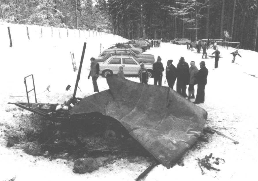 Anschlag Der schöne Bauwagen den Adam Döringer mit einigen Freunden zu einer schmucken kleinen Skihütte ausbaute wurde im Winter 1982 durch Brandstiftung vernichtet. Da sich auch die elektrischen Sicherungseinrichtungen der Liftanlage in der Skihütte befanden, konnte der Lift einige Zeit nicht betrieben werden. |